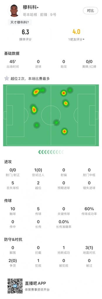 效力于哥本哈根的前锋穆科科此役出战半场便被换下。半场无射门越位两次,10次触球,5次传球,5次丢失球权,传球成功率60%。
