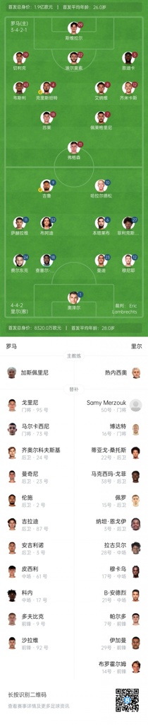 罗马首发:99-斯维拉尔、19-切利克、22-埃尔莫索、5-恩迪卡、43-韦斯利、4-克里斯坦特、8-艾纳维、12-齐米卡斯、7-佩莱格里尼、18-苏莱、11-埃文·弗格森