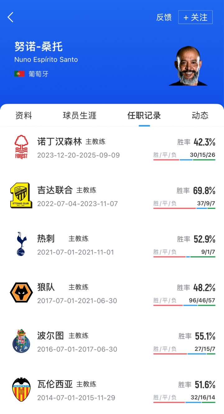 现年51岁的努诺无论是作为球员效力波尔图足球俱乐部时期,还是作为教练执教狼队和沙特职业联赛俱乐部吉达联合期间,都曾多次赢得联赛冠军和杯赛荣誉,是现代足球界最受尊敬的教练之一。
