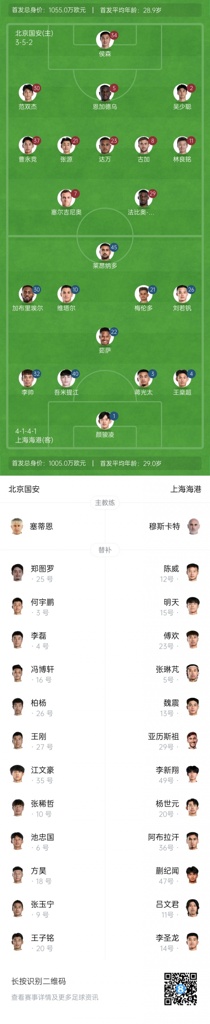 上海海港首发:1-颜骏凌、3-蒋光太、4-王燊超、32-李帅、40-吾米提江-玉苏普、10-马特乌斯-维塔尔(F)、21-梅伦多(F)、22-马修斯-茹萨(F)、26-刘若钒、30-加布里埃尔(F)、45-莱昂纳多(F)